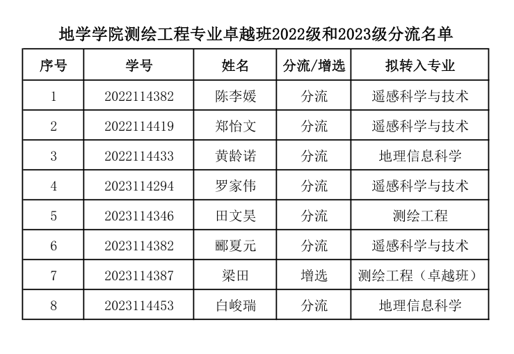 bevictor伟德官网测绘工程专业卓越班2022级和2023级分流名单
