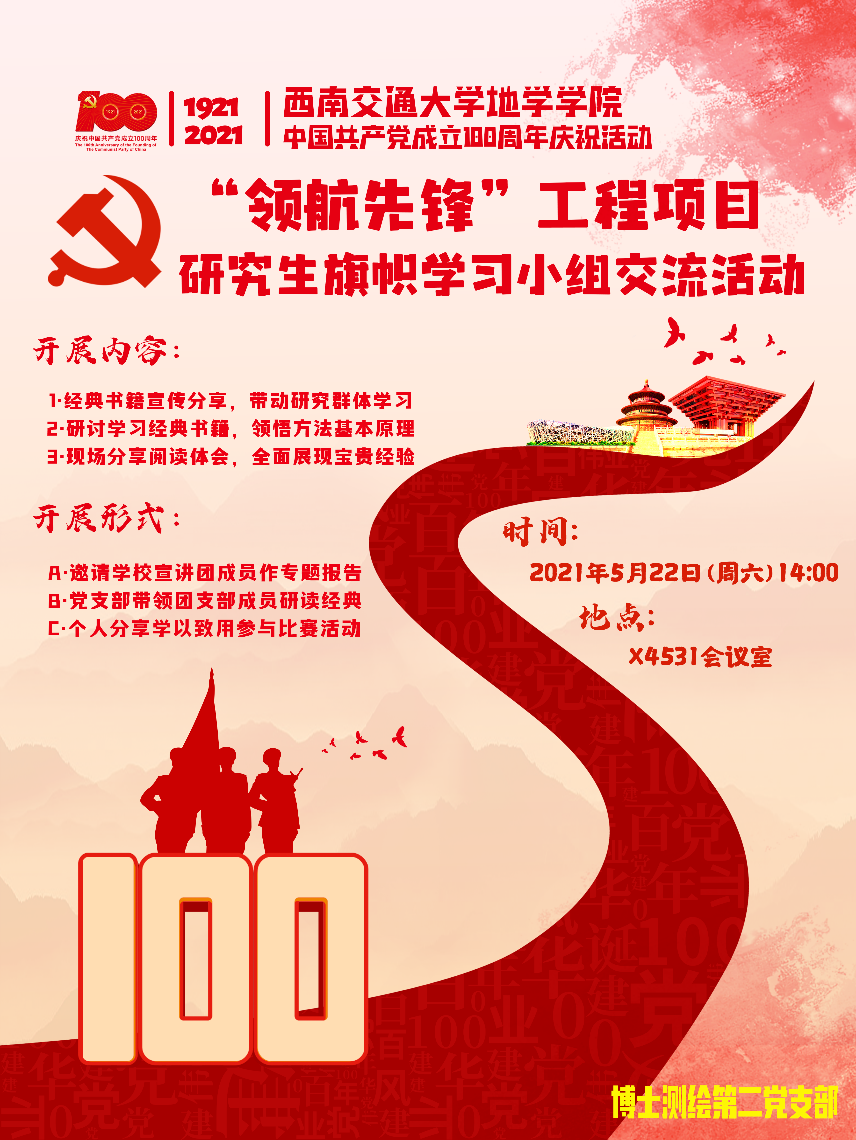 为深入学习贯彻习近平新时代中国特色社会主义思想,热烈庆祝中国共产党成立100周年,深入贯彻落实党史学习教育工作要求,号召全体同学强化思想武装,bevictor伟德官网博士测绘第二党支部于4月-5月成功举办“旗帜学习小组”——研究生马克思主义理论学习小组交流活动。