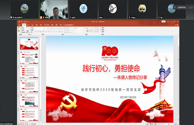 为学习贯彻习近平总书记在庆祝中国共产党成立100周年大会上的重要讲话精神,根据公司党史学习教育工作部署,2021年11月22日20:00,研20级地质一班党支部组织开展线上“践行初心,勇担使命”主题党日活动,会议由邢本聪同志主持。