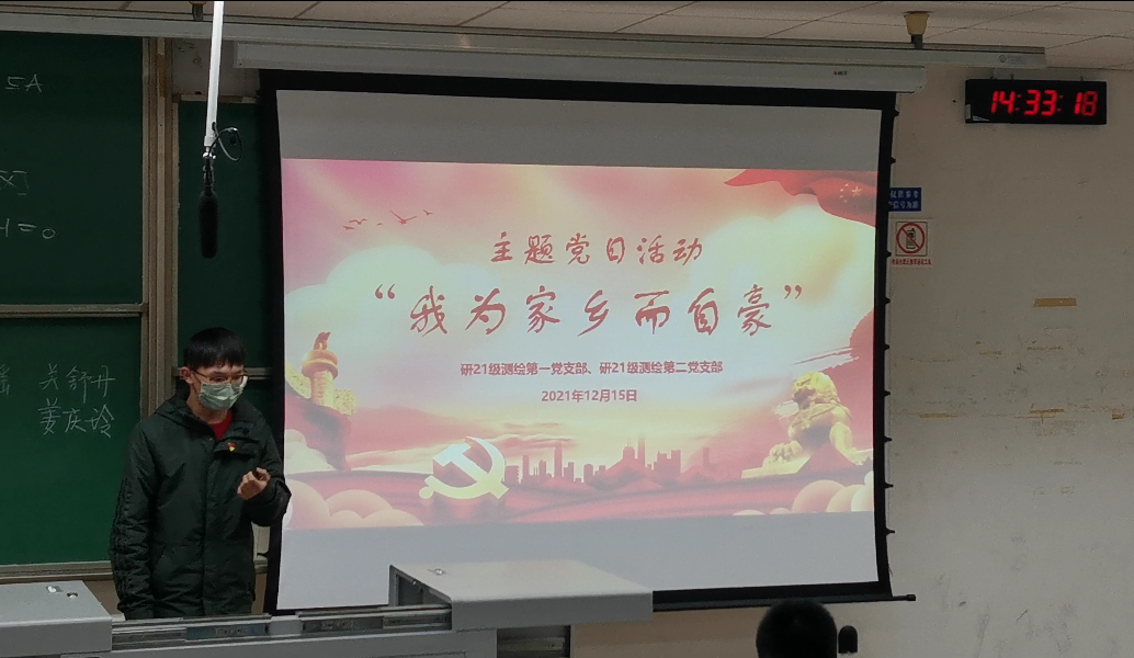 2021年12月15日,研21级测绘第一、第二党支部在J4517开展了主题党日活动——“我为家乡而自豪”。本次活动主要是党员同志通过用家乡的老照片、电影(配音经典片段)、歌曲(演唱红歌)、讲红色革命故事等形式分享家乡的故事。