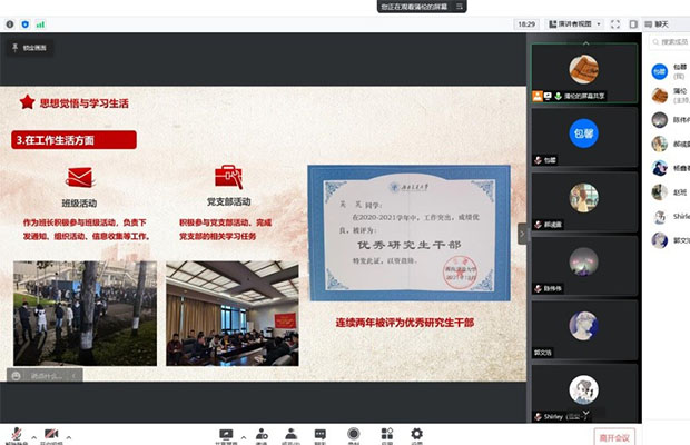 随后,吴昊参加了所在党支部组织举办的“推优入党答辩”大会。答辩开始前,宣传委员徐小凤和组织委员包馨分别清点了线下和线上参加“推优入党答辩”大会的正式党员共计17人,符合召开本次党员大会的人数要求。党支部书记蒲伦介绍了本次答辩会议的目的、议程及候选人的基本情况。