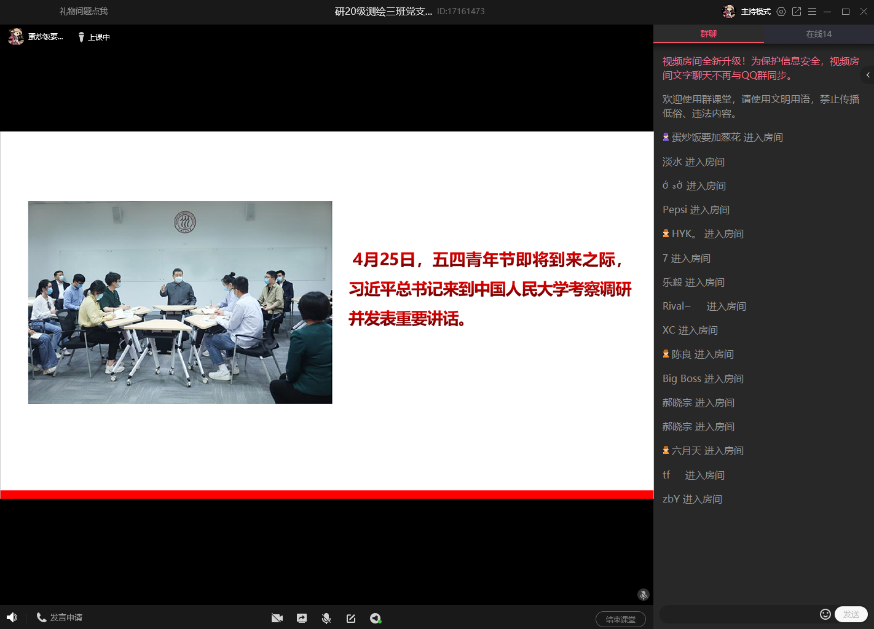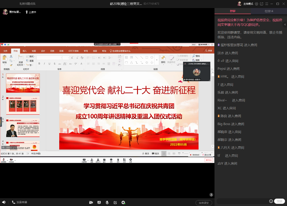 4月25日,在五四青年节即将到来之际,中共中央总书记、国家主席、中央军委主席习近平到中国人民大学考察调研,与师生代表面对面交流谈心,并发表了重要讲话。5月10日,习近平总书记出席庆祝中国共产主义青年团成立100周年大会,并发表了重要讲话。在公司党委的指示下,2022年5月24日晚八点,研20级测绘三班党支部于线上开展了相关学习活动。本次学习活动由支部逄雅洁同志领学。