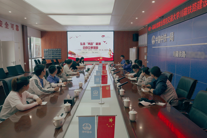 “两路精神被他们赋予了更多的新时代内涵!”在中铁一局项目部五分部,服务团成员联合中铁一局项目部举行“校企携手党建·联学共促实践”—共学“两路精神”专题党课。本次党课主讲人、服务团成员、马克思主义公司博士生王浪在宣讲完后,对同行的成员说:“回去之后,我还要根据此次实践,丰富和完善关于两路精神的宣讲课件,继续深入开展关于铁路史方向的研究”。