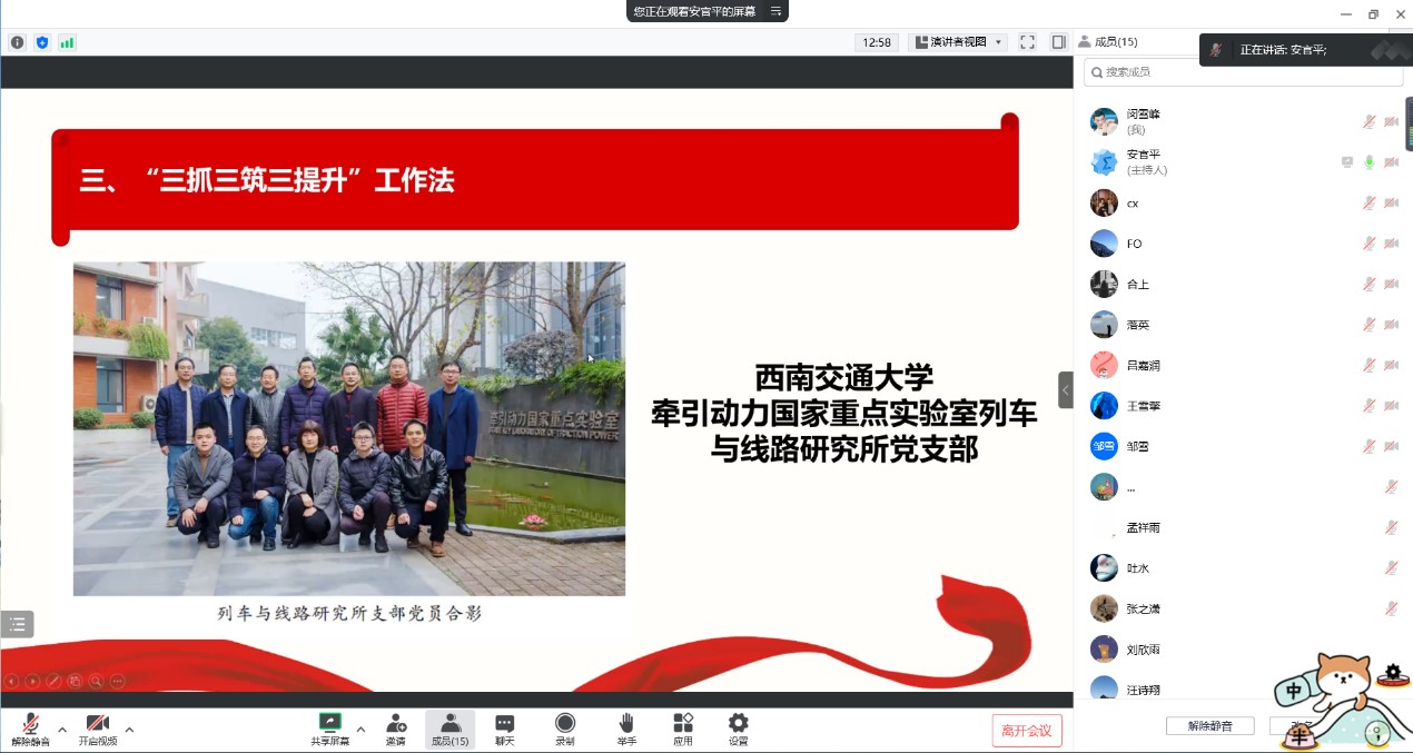 最后,支部书记安官平同志带领支部党员及积极分子,针对习近平总书记指出的“党支部是分布在教研室、实验室、教学科研团队、员工班级中的‘火车头’,也是党联系和团结师生、做思想政治工作的组织依托。要抓在经常、严在平时。”进行了讨论,鼓励党员同志会后继续学习《四川省高校“优秀支部工作法”》,为支部的党建工作贡献自己一份力。