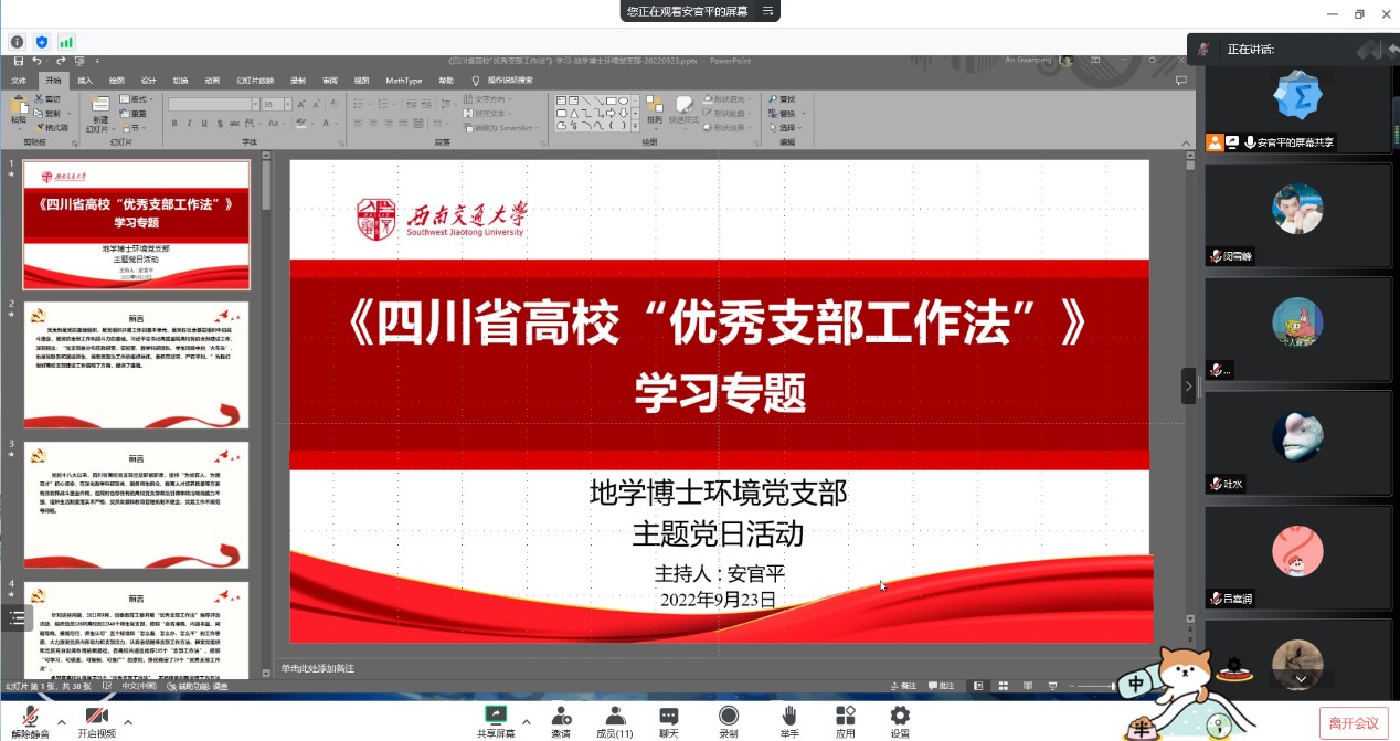 中共四川省委教育工委开展“优秀支部工作法”推荐评选活动,按照“可学习、可借鉴、可复制、可推广”的原则,择优确定了20个“优秀支部工作法”。2022年9月23日19时30分,地学博士环境党支部通过腾讯会议召开学习《四川省高校“优秀支部工作法”》主题党日活动。本次会议由地学博士环境党支部书记安官平主持,地学博士环境党支部党员及全体积极分子参加。