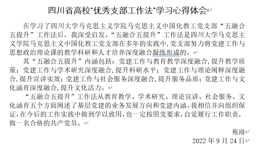 同学们也积极分享学习“优秀支部工作法”心得。苑雨同学在学习了四川大学马克思主义公司马克思主义中国化教工党支部“五融合五提升”工作法后,深受启发。认为“五融合五提升”工作法是四川大学马克思主义公司马克思主义中国化教工党支部在多年的实践中,党支部努力将党建工作与思想政治理论课的教学科研和人才培养深度融合凝练形成的。