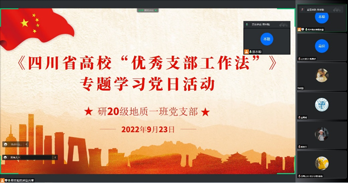 为不断提升川内高公司党建工作质量,以实际行动迎接党的二十大胜利召开,省委教育工委自2021年9月启动了川内高校“党建工作品牌”、“优秀支部工作法”评选活动,并于2022年6月举行了发布推广会。为深化支部成员对高公司党建工作的认识和理解,帮助支部建设拓宽思路,研20级地质一班党支部于2022年9月23日,开展了线上《四川省高校“优秀支部工作法”》专题学习党日活动,进一步学习川内高校优秀党支部工作范例。本次活动由党支书邢本聪同志主持,支部23名成员与会。