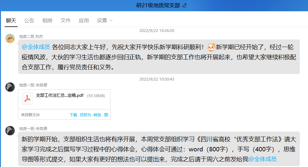 为加强支部的规范化建设,号召支部全体党员投入到支部建设的实际工作中,了解支部在各方面工作的具体内容,同时也学习其他优秀示范党支部的优点长处,结合上级党委工作指示,于2022年9月22日星期五上午10:00,研21级地质党支部在线上集中开展学习《四川省高校“优秀支部工作法》,主要学习优秀党支部的各项工作经验,并要求全体支部成员在学习完成后提交自己的心得体会,由支委会负责收集。本次学习活动由研21级地质党支部组织委员宋自愿主持,参加此次活动的有研21级地质党支部全体正式党员及预备党员。