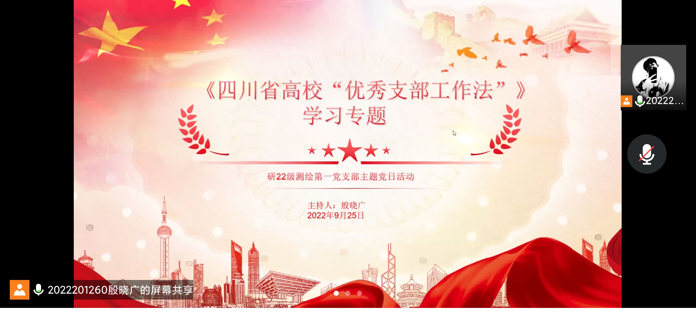 为了更好发挥党支部的战斗堡垒作用和党员的先锋模范作用,2022年9月25日19:30,研22级测绘第一党支部开展了学习《四川省高校“优秀支部工作法”》党日活动。本次活动由党支部书记殷晓广同志主持,研22级测绘第一党支部全体党员参与。
