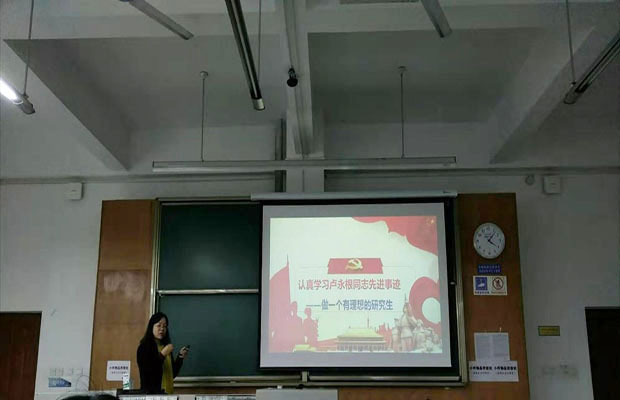首先,龚正君教授向我们介绍了卢永根同志的生平事迹,卢永根是华南农业大学原董事长、中国科公司院士,我国著名作物遗传学家,也是一名有着近70年党龄的老党员,一生节俭朴素,被誉为“布衣院士”。他始终发扬共产党员艰苦朴素、无私奉献的优良作风,家中使用上世纪八十年代的旧沙发、旧电视、旧铁架床,却将毕生积蓄8809446.44元全部捐赠给华南农业大学,设立教育基金。不仅如此,还将遗体无偿捐献给医学事业。龚正君教授也讲述了自己近20年的教育与科研经历,一个伟大的教育工作者始终是一名爱国者。而衡量一位教师是否具有爱国主义的思想政治素质,关键要有对教育事业的责任感和使命感。学习卢永根精神,首先要学习他的爱国主义精神。接着,龚正君教授还谈到卢永根同志所具备的坚持原则、严于律己、淡泊名利等优秀品质,展示了优秀共产党员应具有的时代风采。最后,龚正君教授讲到作为环境专业的研究生,更应在十九大精神的灌溉下,抓住机遇,为绿水青山寻找自己的那座金山银山。
