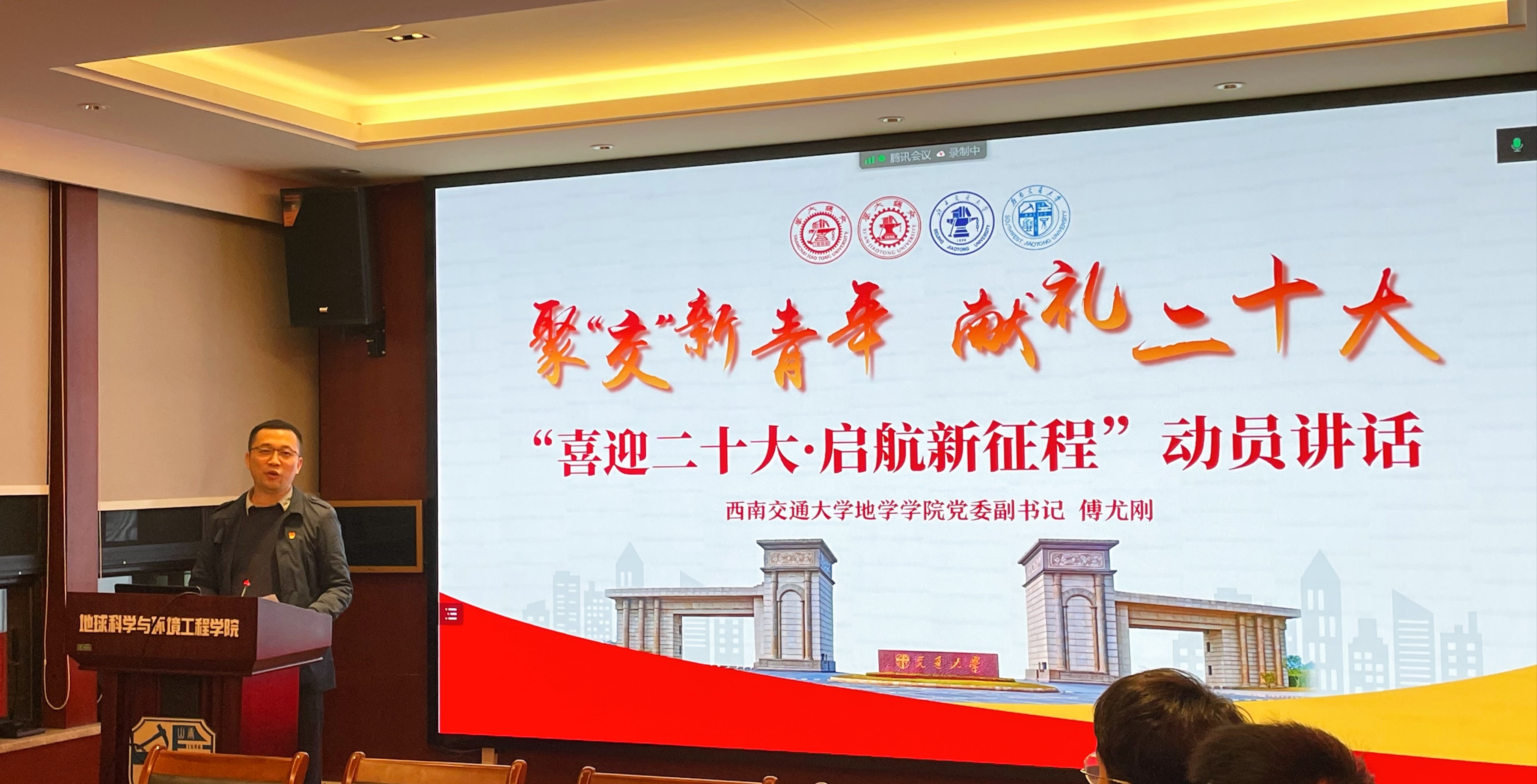 接着公司党委副书记傅尤刚老师做了关于“喜迎二十大,启航新征程”动员讲话,对于二十大精神的学习,傅书记给全体同学们提了三点倡议,第一:要从思想和政治站位上充分认识党的二十大重要意义和精神实质。第二:要以实际行动和优异的成绩来迎接党的二十大的召开。第三:要充分利用好聚“交”新青年的平台和载体,将其逐步形成后续的常态化、制度化的一种活动形式,实现支部共建共学,充分汲取四所交大饮水思源、同根同源的精神养分。