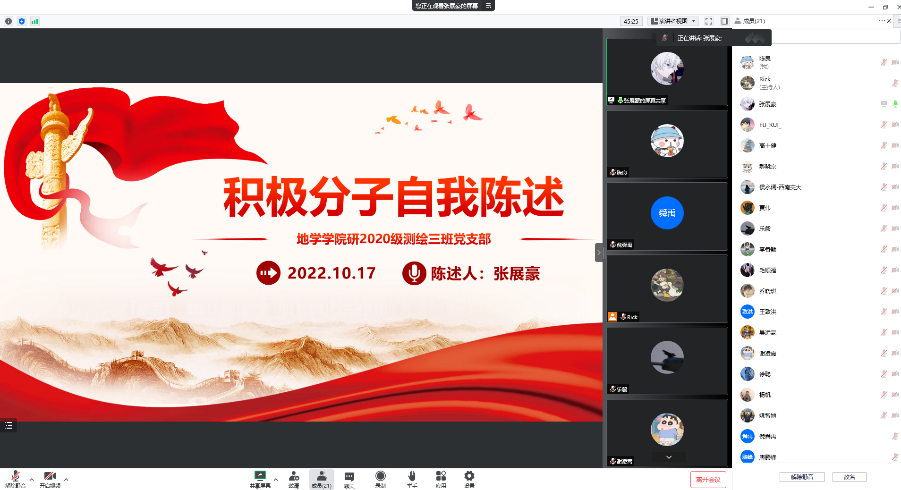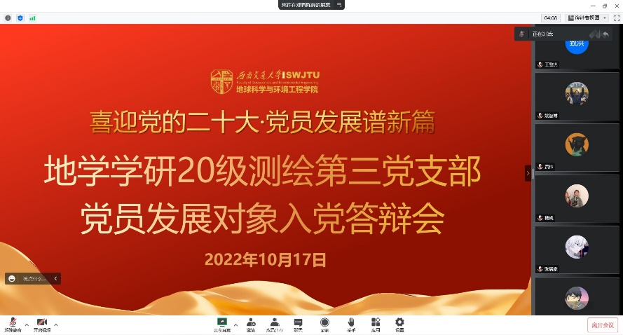 为做好2022年下半年党员发展工作,切实提高党员发展质量,bevictor伟德官网研20级测绘第三党支部于2022年10月17日20:00在线上开展了2022-02期发展对象人选的“推优入党答辩”大会。会议由组织委员陈良主持,全体党员和入党积极分子参加。