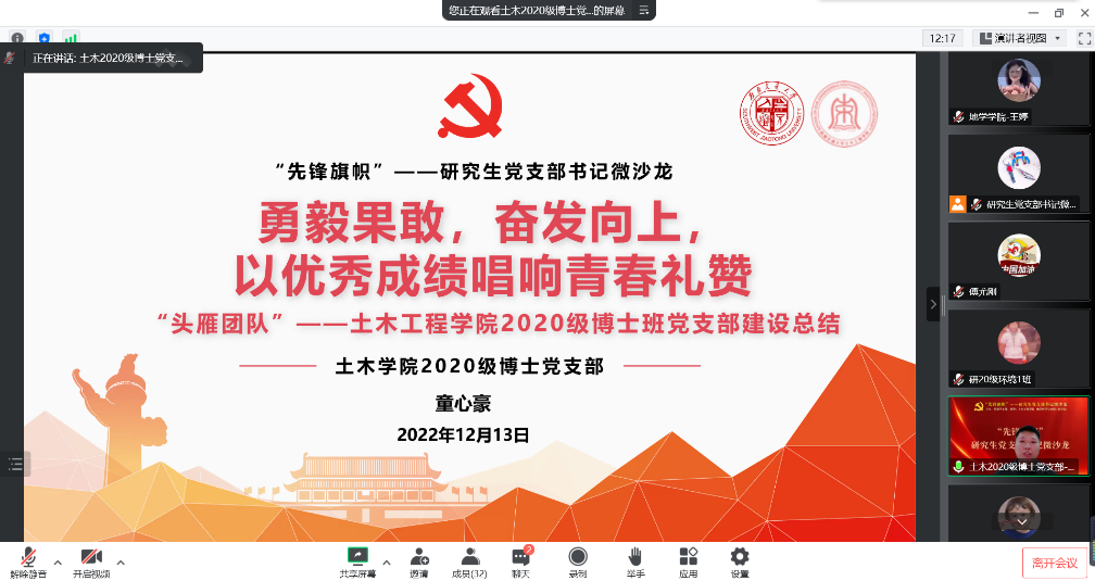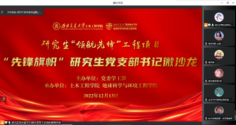 为深入学习贯彻落实党的二十大精神,积极发挥党支部书记的领头羊作用,共同学习探索更加高效和高质量的党支部工作思路与方法,公司党委联合土木公司党委于20221213日通过线上的方式举办研究生党支部书记微沙龙活动,旨在以沙龙座谈交流的形式促进跨公司党支部共学共享,提供员工党支部书记交流平台,深入探讨研究生支部建设以及党员教育、管理的疑难杂症,提升党支部书记的政治素养与业务能力。本次活动邀请了公司党委副书记傅尤刚、土木公司研究生党总支书记石莹、土木公司研究生辅导员强博文,活动由​bevictor伟德官网员工党建负责老师文强主持,​bevictor伟德官网及土木公司研究生党支部书记代表参加。