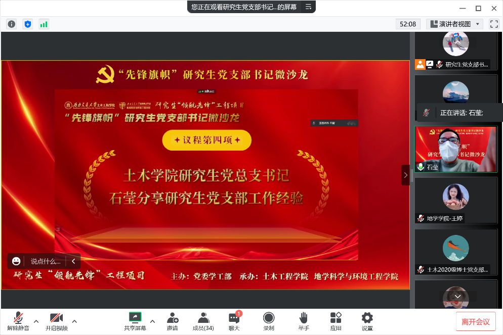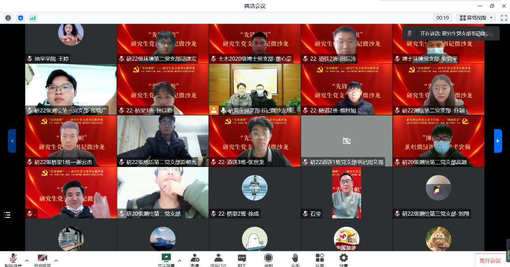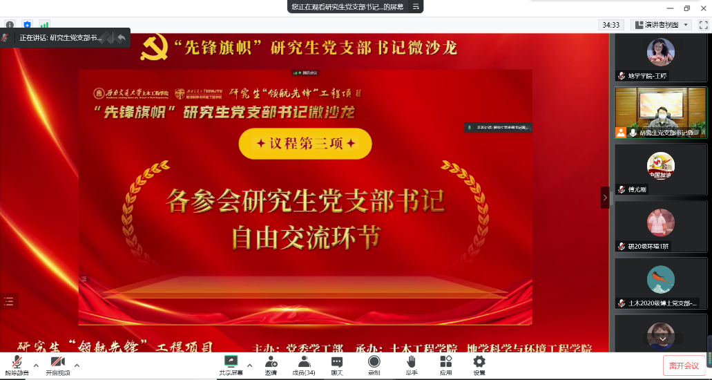 之后,各参会研究生党支部书记进行了自由交流,各党支部书记针对疫情形势下线上开展党日活动的创新性、提高支部党员参与活动的积极性等问题进行了交流学习,相互分享优秀经验,提出了党员积分制考核方法、将专业学习党建工作相互融合等方法,在提高党日活动的吸引力的同时,也有利于筑牢党员的角色意识。