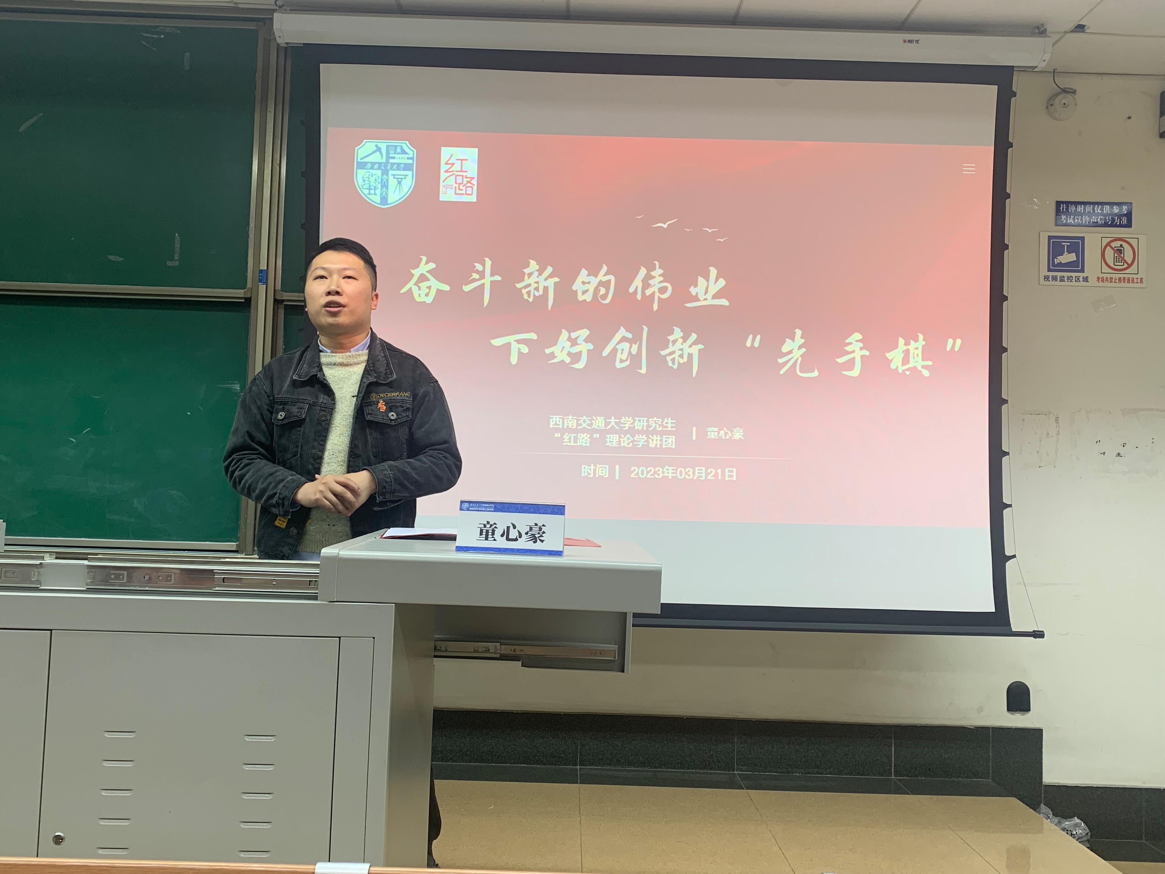 首先土木工程公司2020级博士研究生童心豪以《奋斗新的伟业,下好创新‘先手棋’》为题,进行了关于“实施科教兴国,强化现代化建设人才支撑”的学习分享。童心豪同志从道路、交通的变化作为开篇,结合自身科研经历,解读了党的二十大报告中科教兴国的含义。