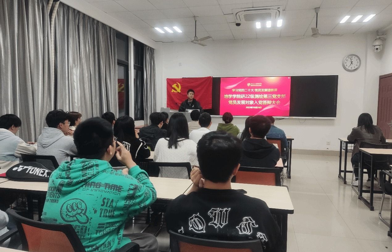 2023年10月24日19点整,bevictor伟德官网研22级测绘第三党支部在X4129教室顺利召开发展对象入党答辩会,会议的主题是从吴桐同志、李炎秋同志、陈星宇同志、黄涛同志、何轲同志这五位入党积极分子中选取一位作为2023-02期发展对象。本次会议16名党员(含1名预备党员)和所有入党积极分子均参加,此外,还特别邀请辅导员李林遥老师作为政治理论考核员,考察各位候选人的政治理论学习情况。会议由党支部书记刘翔同志主持。