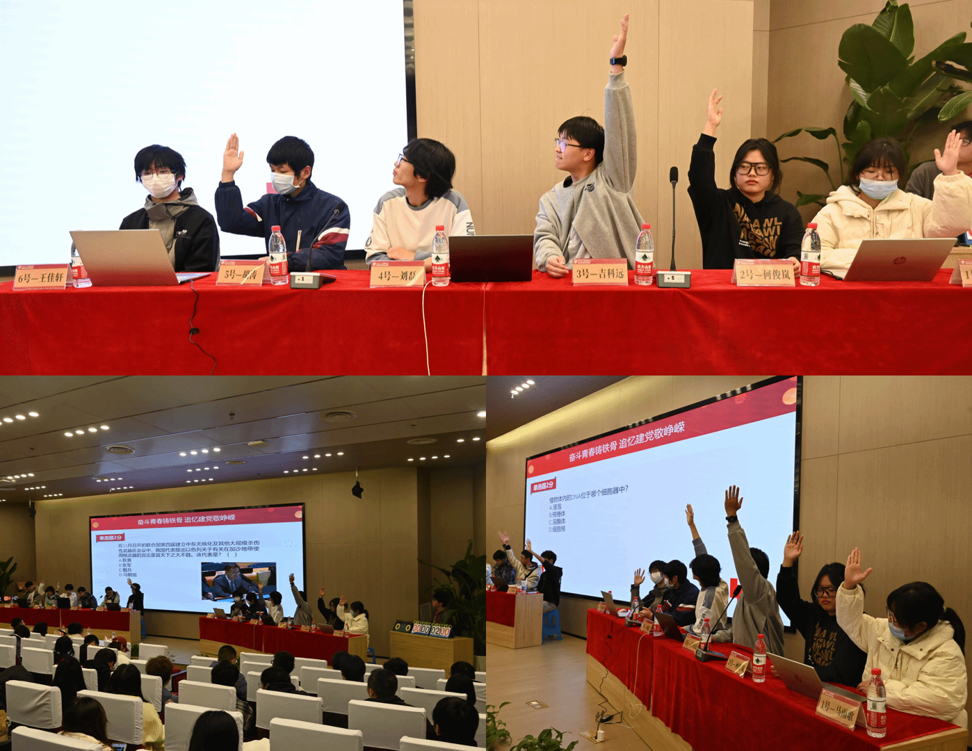 决赛共有星火燎原、峥嵘初现、翻天覆地、波澜壮阔四轮比赛,题型丰富,题目新颖,由选手现场作答,形式均为单人答题。报告厅内气氛热烈,选手们积极迎战,思维敏捷,展现出深厚的理论功底和扎实的知识储备。在星火燎原、翻天覆地两轮抢答环节,选手们更是快速反应、迅速答题,赢得观众的阵阵掌声。在比赛氛围感染下,针对部分难度较高选手难以回答的题目,不少观众也踊跃举手,参与答题过程。