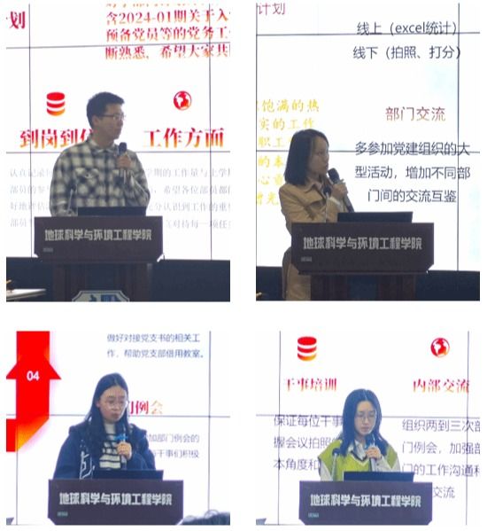 随后,各部门部长及干事上台总结上学期工作及本学期规划。学习部计划本学期认真记录到岗部员的参与,加强部员充分认识到工作的重要性;监管部提出要多参加党建组织的大型活动,增加不同部门间的交流借鉴;活动部同地学青协商量将由公司党建事务中心接管方碑社区公益课堂,并将面向党建事务中心全体同学进行招募,加强对活动的规划和管理;宣传部计划本学期保证每位干事掌握会议拍照角度和要求,组织两到三次部门例会,加强部门的工作沟通与交流。