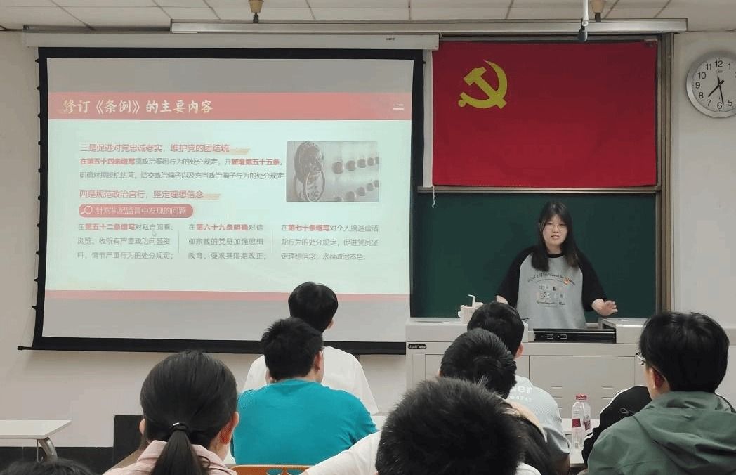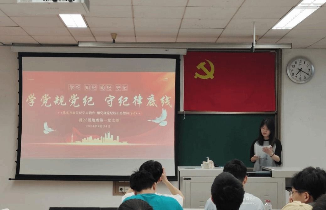 2024年4月24日下午19时30分,研23级地质第一党支部于J4221教室顺利召开了“学党规党纪,守纪律底线”主题党日活动,本次活动旨在深入学习贯彻习近平总书记在二十届中央纪委三次全会上的重要讲话,学习宣传习近平总书记关于总体国家安全观的重要论述,认真学习《中国共产党纪律处分条例》,扎实开展党纪学习教育,用党规党纪校正思想和行动。本次党日活动分为党纪学习教育和观看国家安全教育视频两个环节开展,由党支部书记张雨晴同志主持,支部成员总计17人与会。