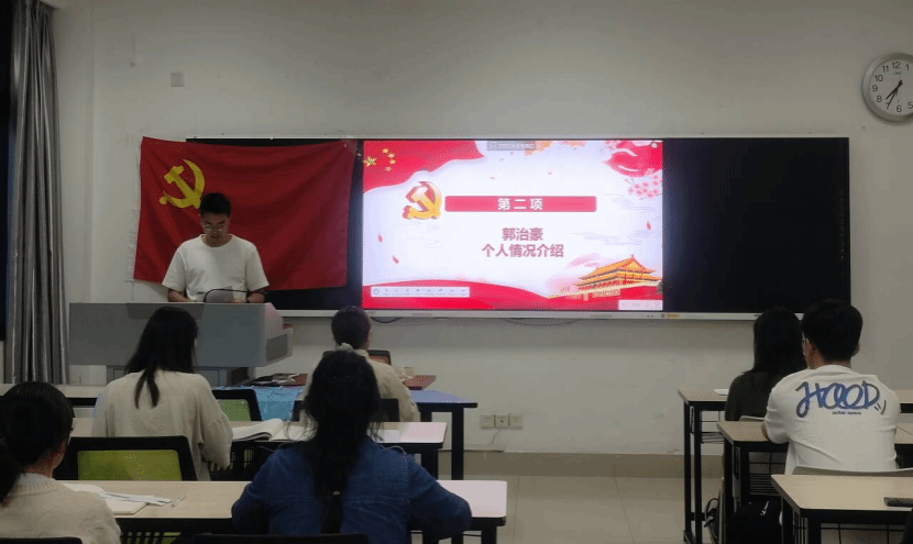 大会第三个环节,由支部组织委员汇报发展对象的审查情况。龚依婷同志表示,经查阅郭治豪同志的相关档案材料及有关单位或函调了解,其本人及直系亲属及联系密切的主要社会关系是清楚的,并根据一段时间考察培养,其政治立场坚定,思想同党中央保持一致,认真工作。在广泛征求党内外党员、群众意见的基础上,经过支部委员会充分酝酿和认真讨论,一致认为郭治豪同志基本具备党员条件,决定提交支部党员大会讨论其能否被接受为预备党员的问题。大会第四个环节,现场全体党员同志进行讨论并发表意见。全体正式党员表示,郭治豪同志在校期间表现良好,思想端正,作为副班长,尽职尽责,并积极向党组织靠拢。