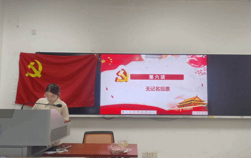 大会第五个环节,无记名投票。全体党员进行投票,并由宣传委员进行计票,组织委员监票。大会第六个环节,党支部书记宣读表决决议。本次大会表决权的正式党员应到16人,实到13人,未到会的2人提交了书面意见,表决结果赞成14票,反对票0票,弃权票1票。任颖同志表示,实际同意人数超过党员人数的一半,同意接收汪宇同志为预备党员。