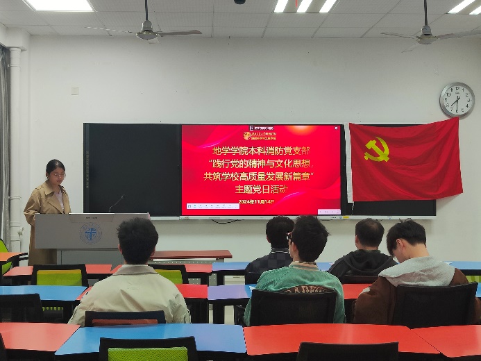 2024年11月14日,本科消防党支部于X4136开展11月党日活动,,旨在深入学习习近平总书记在各地考察时的重要讲话以及党的二十大、二十届三中全会精神支部成员积极参与。党支部成员杜彦微,安萌为主讲人。