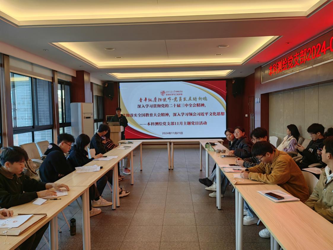 为推动支部内同志学习贯彻习近平总书记系列重要讲话精神,本科测绘党支部于2024年11月21日在犀浦校区X4520举办11月份党日活动,冯宇昊同志主持本次活动。此外有5位积极分子列席本次活动。