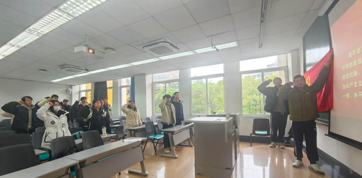 转正大会的最后,支部全体党员在鲜红的党旗下重温了入党誓词。铿锵有力的誓言进一步坚定了每位党员的初心与使命。