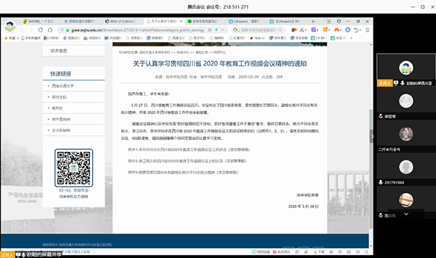根据公司党委“抓好疫情防控不放松,抓好各项重要工作不懈怠”的要求,研2019级环境一班党支部落实公司工作安排,积极开展学习会议精神。于4月1日通过腾讯会议平台开展了线上学习活动对四川省2020教育工作会议精神进行了认真学习。学习过程主要围绕李光华同志和李江同志在会议上的讲话和省委常委甘霖同志和副省长杨兴平同志批示精神展开。会议由支部书记赵聪同志主持。