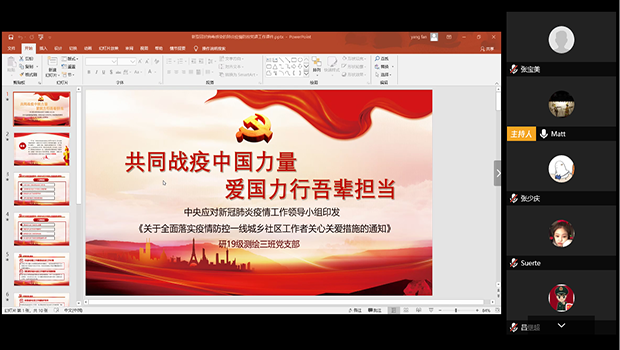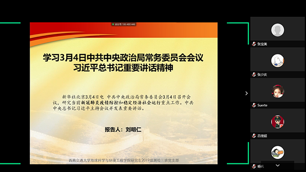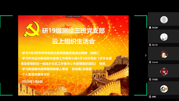 3月6日下午,bevictor伟德官网研究生2019级测绘三班党支部在腾讯会议平台召开主题为“共同战疫中国力量,爱国力行吾辈担当”的云上组织生活会。会上,支部三名党员分别带领大家学习理解习近平总书记最新重要讲话精神、中央最新出台的关于防控疫情工作的措施和抗疫期间的动人故事,增进支部成员对目前党和政府疫情防控和稳定经济社会工作的了解,激发支部成员的爱国主义奋斗精神。支部4名党员和3名入党积极分子参加会议,会议由支部书记刘明仁主持。