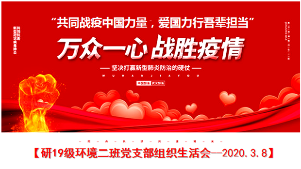 疫情进入攻坚期,为充分发挥党支部战斗堡垒作用、党员先锋模范作用,深入学习贯彻习近平总书记关于新冠肺炎疫情防控工作系列重要讲话精神,2020年3月8日下午,研19级环境二班党支部依托“腾讯会议”平台,在线召开了一次以“共同战疫中国力量,爱国力行吾辈担当”为主题的云上组织生活会。会议由支部书记陈俊文主持,五名正式党员、三名入党积极分子参会。
