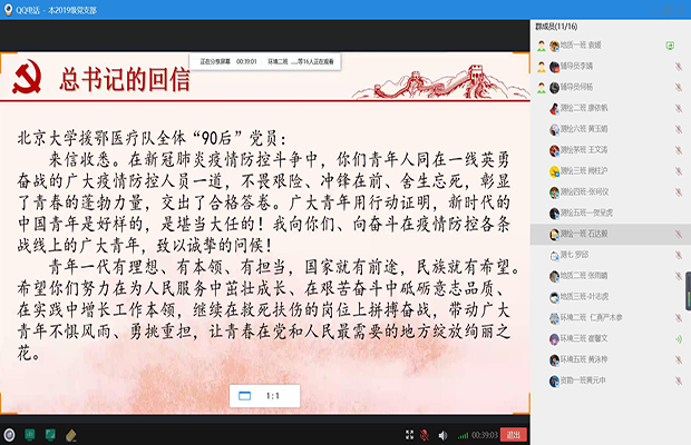 5月4日下午2点,bevictor伟德官网本科2019级党支部于线上顺利开展“学习回信精神,勇担时代之任”主题党日活动。2019级辅导员李婧、何杨老师和2019级党支部成员参加此次活动。本次会议由袁媛同学主持。