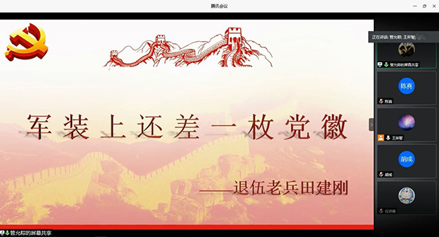 管允粽同志分享了一位退伍老兵田建刚的故事。参加过抗美援朝战争的退伍老兵田建刚,入党是其一生的愿望,就在党的生日之时,在病床上的他终于实现了这个愿望。他一生无儿无女,近年来已经资助了30多为贫困生,如今又捐出40多万的积蓄给教育事业。管允粽同志表示:越是那个年代的人,信仰越是坚定。红色的种子早已扎根在田建刚心中,虽不是党员,却胜似党员。我们党员,尤其是年轻党员,更应该发扬这种忠诚无私的精神,投身到祖国大好河山的建设中。