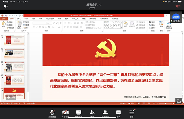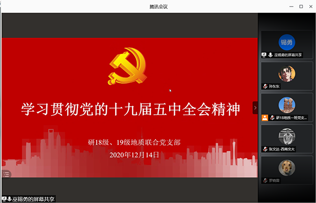 2020年12月14日晚7点,bevictor伟德官网研18级、19级地质联合党支部邀请巫锡勇老师给我们开展了关于“学习贯彻党的十九届五中全会精神”党课活动,巫锡勇老师主要以“十九届五中全会规划建议起草、规划建议亮点、规划建议突出的民生主题、双循环新发展格局、2035远景目标以及西南交大十四五规划目标”这五个方面进行阐述与讨论。会议由研18级地质一班张绍科同志主持。