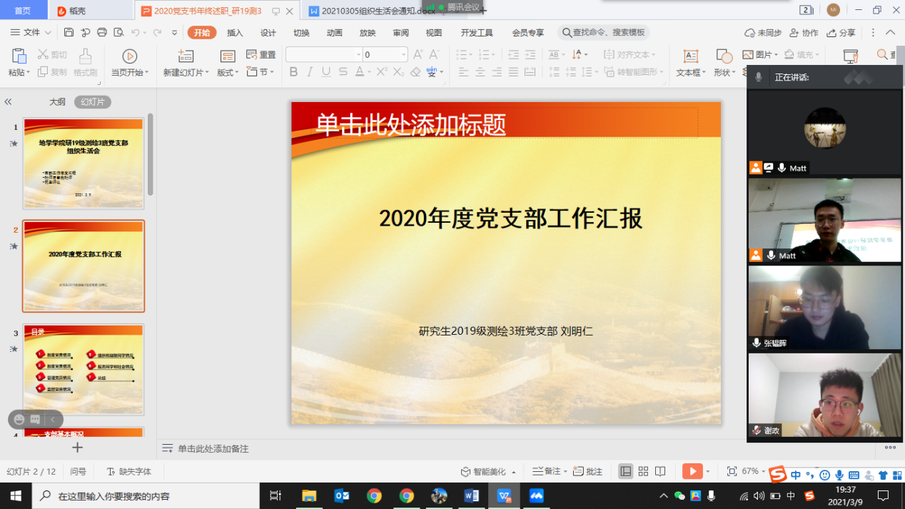 3月10日晚,研19级测绘三班党支部在X2338教室召开组织生活会,会上支部书记代表支部委员会做了年度工作总结汇报,然后全体与会党员开展了批评与自我批评,并在专业学习和日常生活方面做了交流,最后进行了民主测评。会议由支部书记刘明仁主持,支部5名党员参加,因部分同学在外实习,会议以线上线下结合的方式进行,线下有3名党员参会,线上2名党员参会。