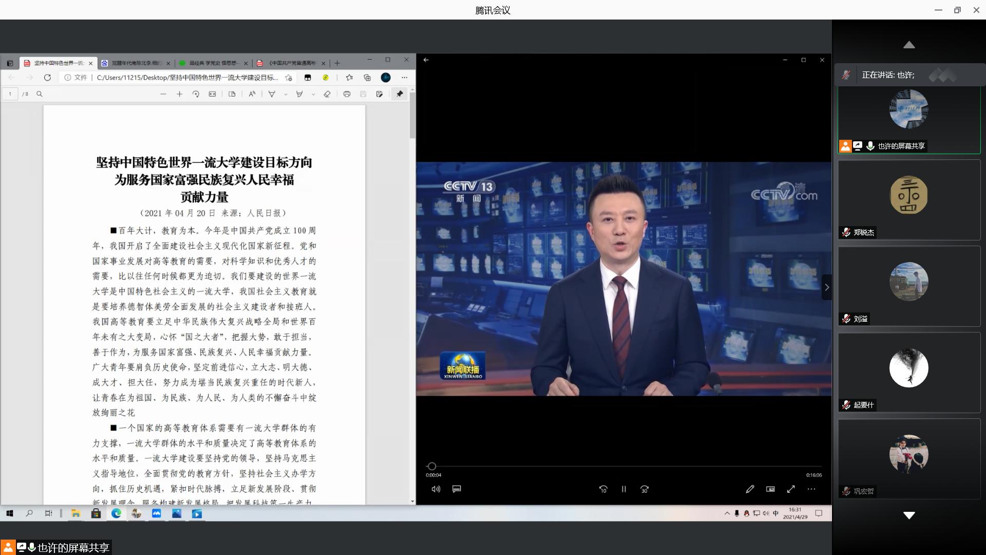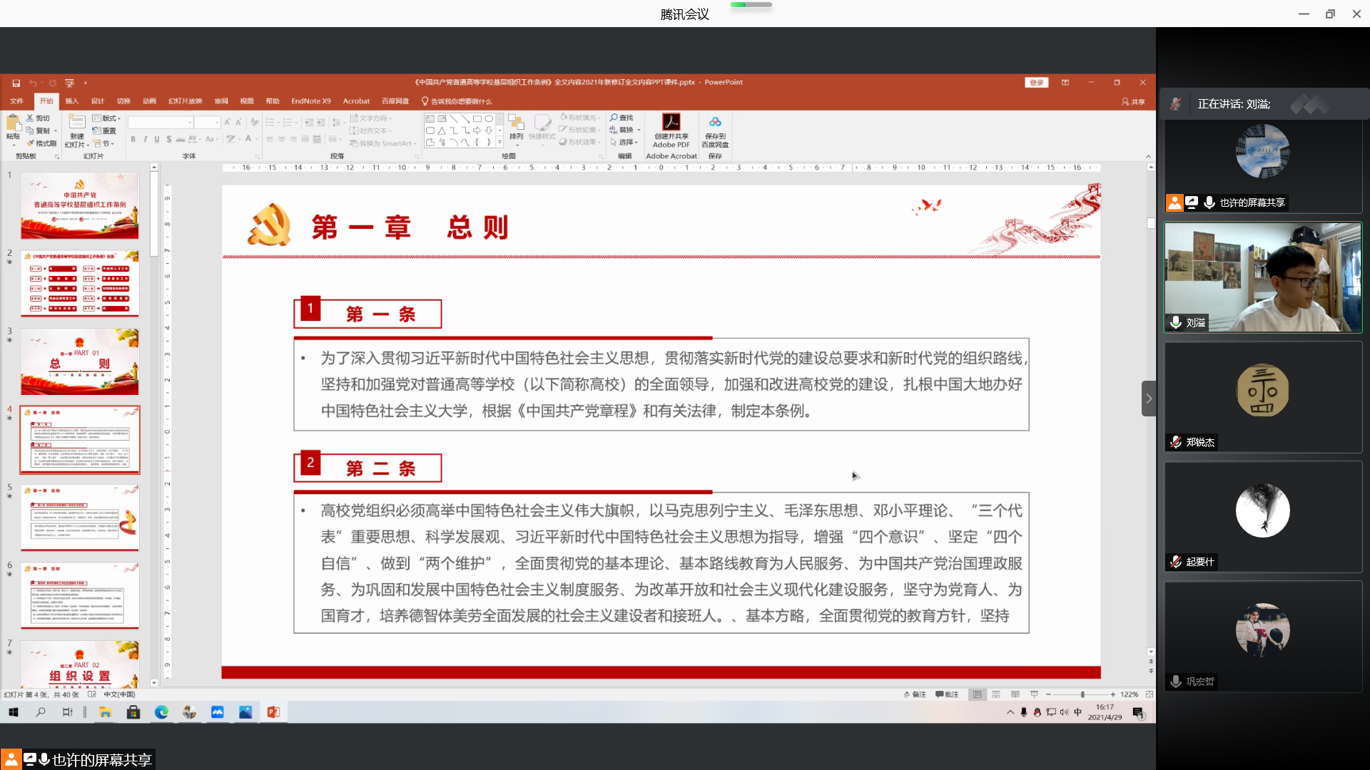 在学习习近平总书记在清华大学考察时的重要讲话精神后,由钱嘉侦同志领学修订后的《条例》,《条例》对“党组织的设置、党组织的职责、纪律检查工作、党员的教育管理和发展、干部和人才工作、思想政治工作、党组织对群众组织的领导”等内容提出了明确的要求,体现了党的理论创新、实践创新、制度创新的最新成果,吸收了各地各高等公司党的建设的新经验。领学结束后,参与线上会议的支部同志开展了深入谈论交流,一致认为要认真学习《条例》的精神实质,今后党支部组织开展工作要严格遵循《条例》的基本规章。