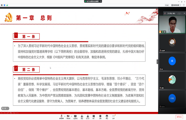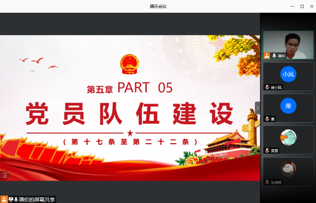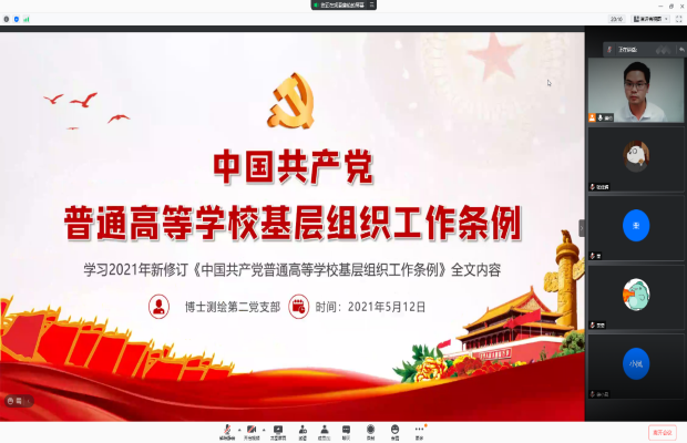 为以高质量的党建工作引领推动公司的国际化示范公司建设,全面规范院内基层党组织的建设,bevictor伟德官网博士测绘第二党支部于2021年5月12日晚20:30在腾讯会议(会议ID:972 655 275)开展了《中国共产党普通高等公司基层组织工作条例》(以下简称《条例》)集中学习活动。本次学习活动由支部书记蒲伦主持,支部内全部党员和入党积极分子参加。