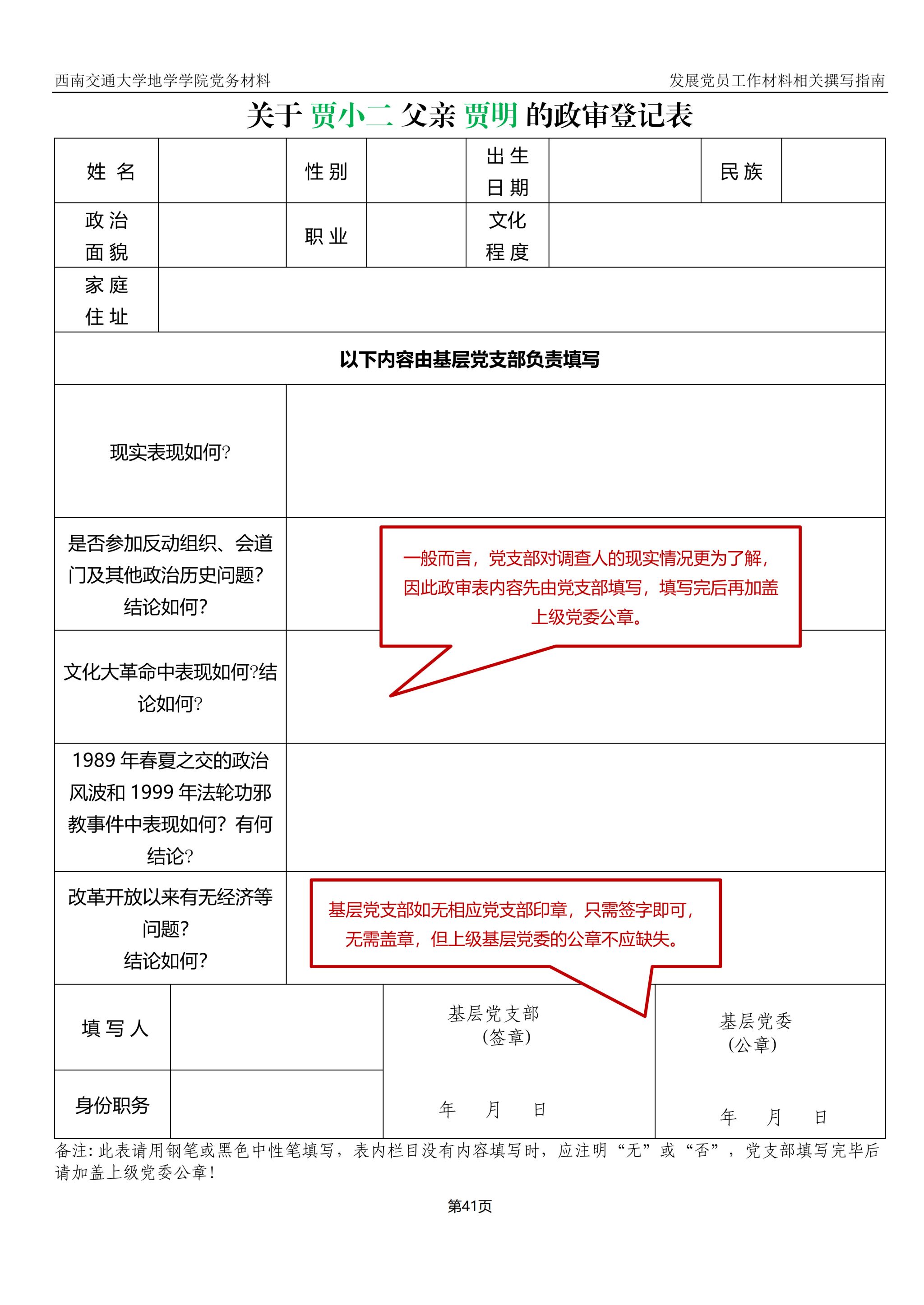 2.父母有工作单位的,让父母拿去单位党组织,让单位党组织直接填写政审登记表(需加盖单位党委章,而非公章),并写好函调回信(需加盖单位党委章,而非公章),再按照第二联公司地址寄回(收件人和收件电话填写各自党支部书记的收件信息)。