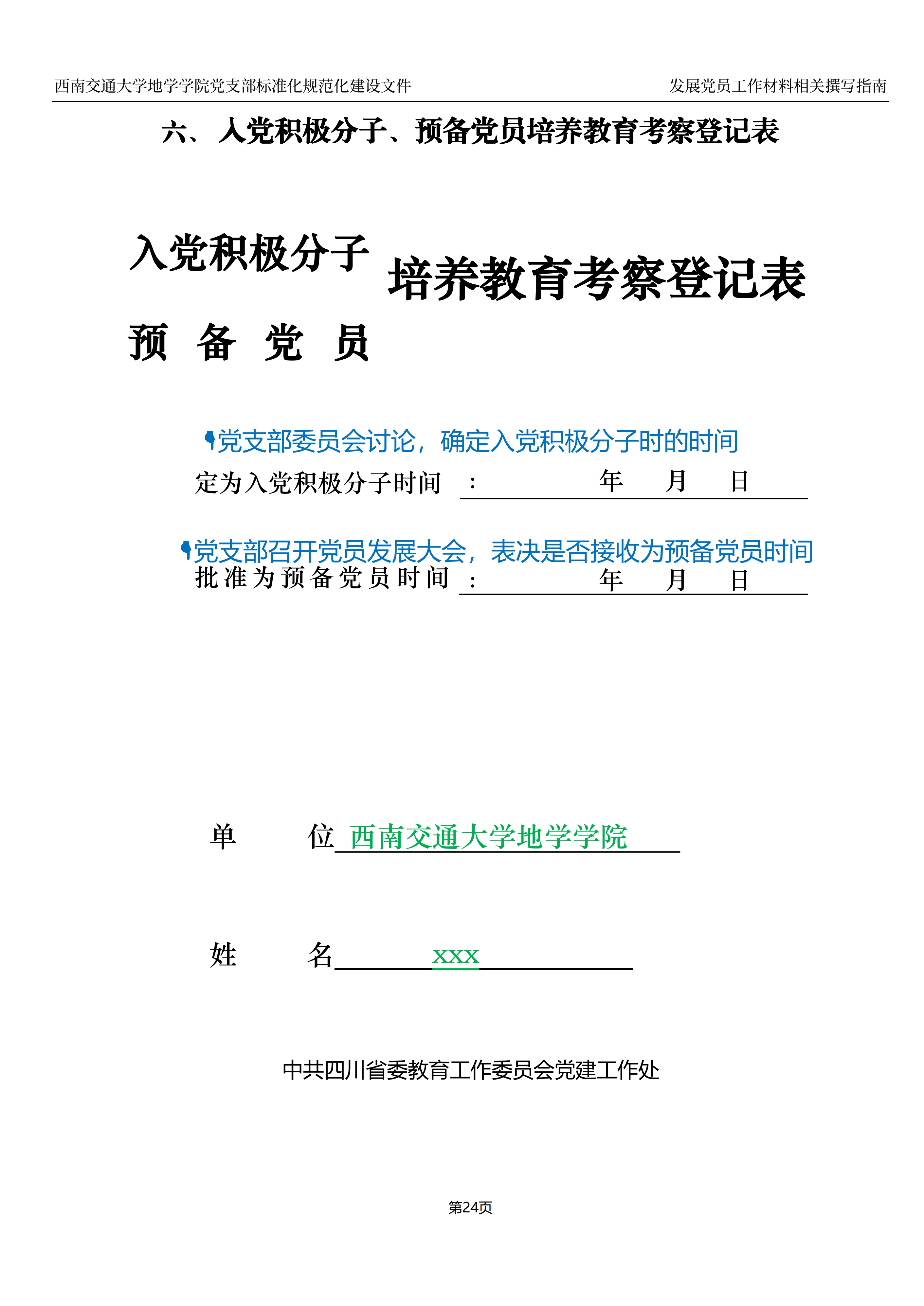 入党积极分子、预备党员培养教育考察登记表封面样例: