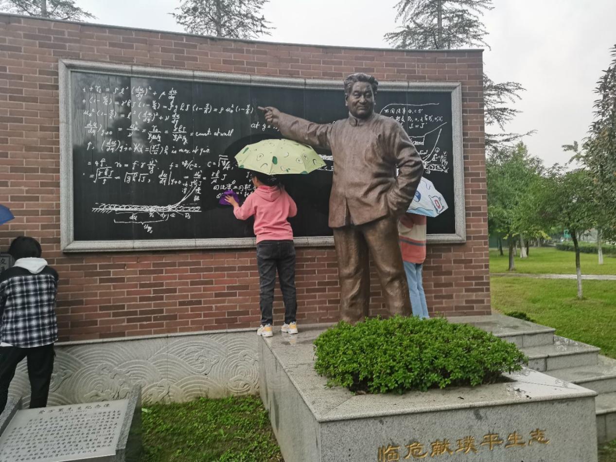 由于活动当天有一定的降水,所以同学们两两合作,一人撑伞一人对雕像进行擦拭,就算是有雨点掉落在脸上,打湿在衣服上,也没有一丝一毫的怨念,因为比起前人筚路蓝缕在科研道路上的摸爬滚打,这点小风小雨根本不算什么。正是因为有前人的不断探索,前赴后继的投入到报国事业中,我们的国家才变得越来越好,人民也才能安居乐业,我们也才能接受到良好的教育,所以我们才要自发的维护清理这些伟人先驱的雕像。我们清洗的不仅仅是雕像我们也在清洗自己的浮躁与内心的迷茫,我们在清洗的过程中通过对詹天佑先生,黄万里先生,罗忠忱先生事迹的回顾与进一步了解,从而了解坚定自己的梦想和信念。