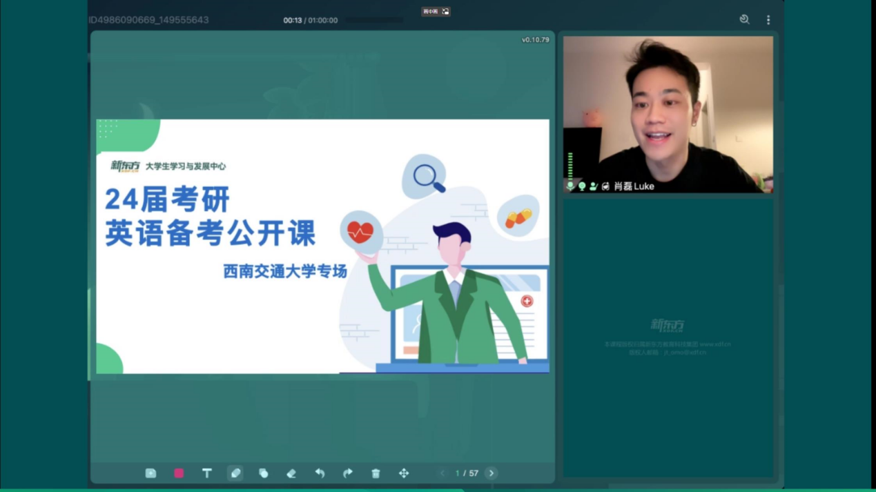 为加强员工对考研英语知识和经验的了解,营造积极向上的学风,同时为公司正在和即将备考的员工增强考研信心,2022年9月13日下午7时,公司团委班级联合会、就业指导中心联合了新东方考研机构的肖磊老师以网上宣讲的形式为各位员工提供了考研英语的复习备考的经验分享。