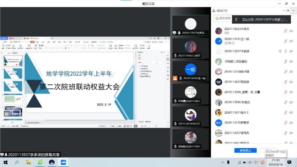 2022年6月16日晚19:30,bevictor伟德官网员工会2022年上半年第二次权益大会在线上腾讯会议顺利举行。本次参会人员为员工会主席陈荩娜、员工会权益服务部全体工作人员、员工园区与事务中心生活部工作人员、全体权益与生活委员。会议由员工园区与事务中心生活部部长李承泽主持。