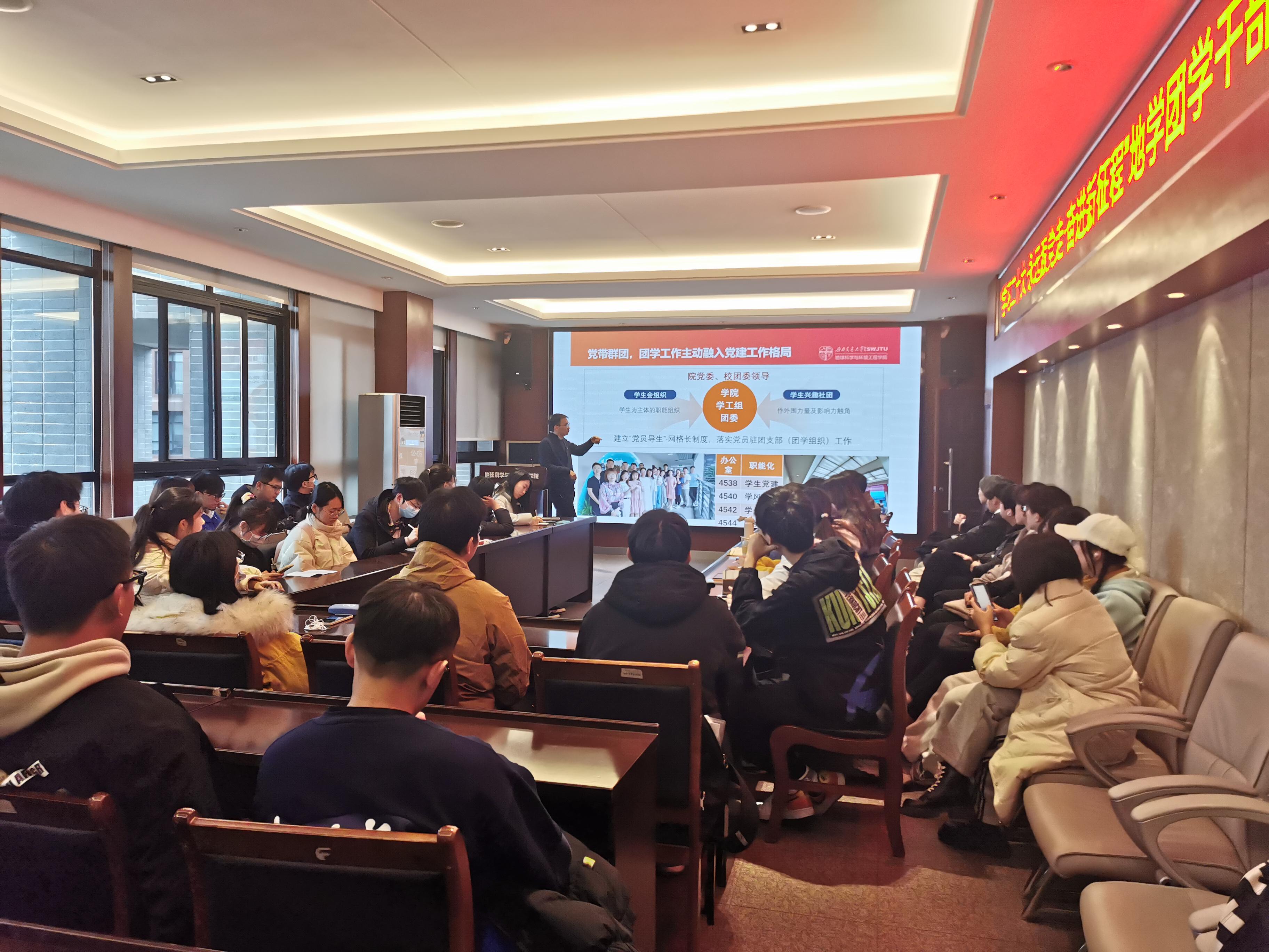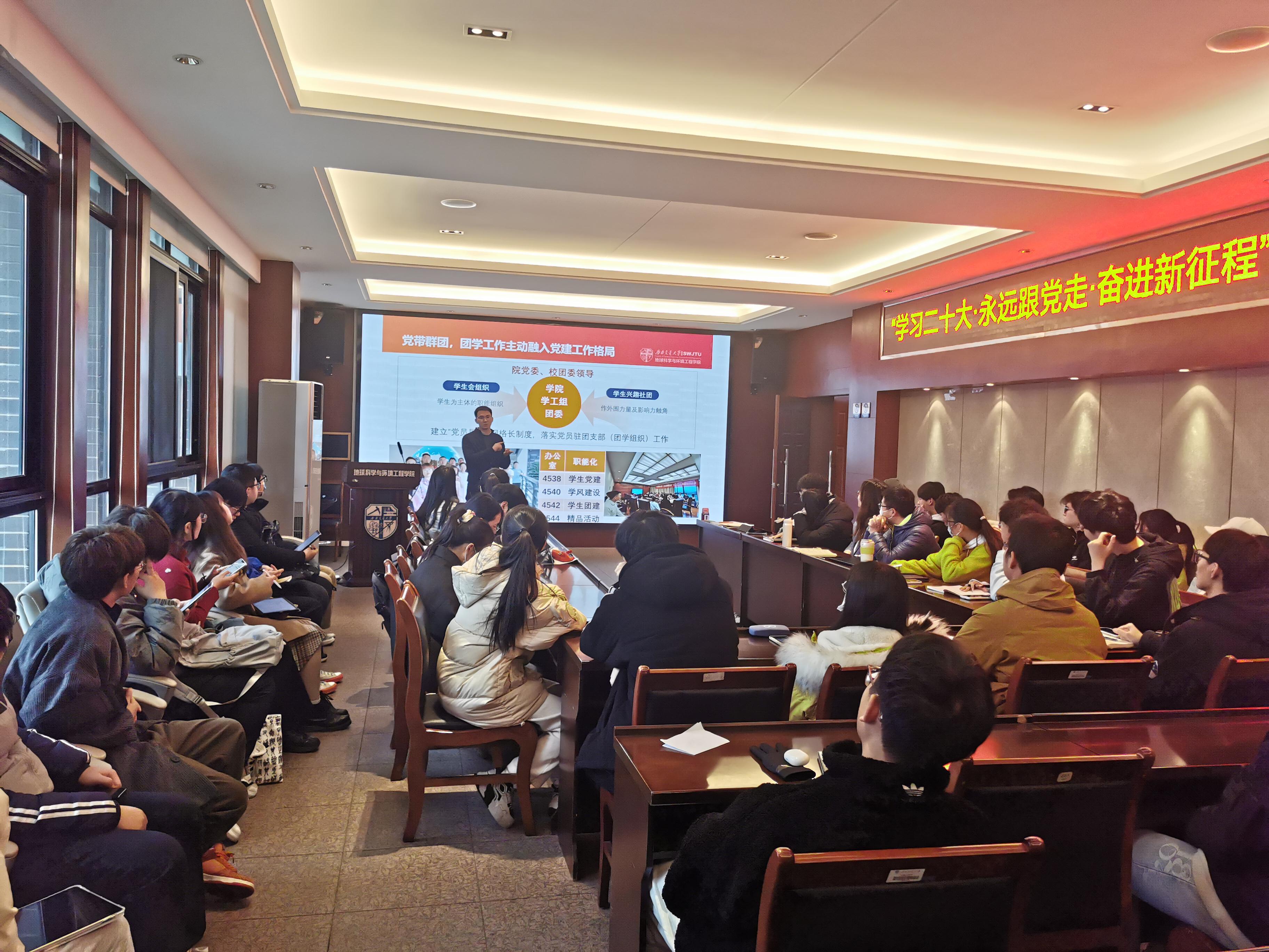会议最初,杨都强老师就员工干部深入学习贯彻党的二十大精神做了明确要求,鼓励同学们先通过读原文等形式产生自己对党的二十大报告的理解,再到各个班级团支部之间开展学习宣讲活动。杨都强老师对党的二十大精神的重要内涵进行了宣讲,通过援引邓小平同志答记者问等例子,从多个层次对中国式现代化的五个特征进行解读,强调中国式现代化符合中国的国情特色。他号召同学们坚守奋斗精神,在深入领会二十大精神并向身边同学积极传播的同时,一定要注重把精神学习与自己的成长实际相结合,做到勤勉刻苦、准确把握、求真务实,展现员工干部青春本色。