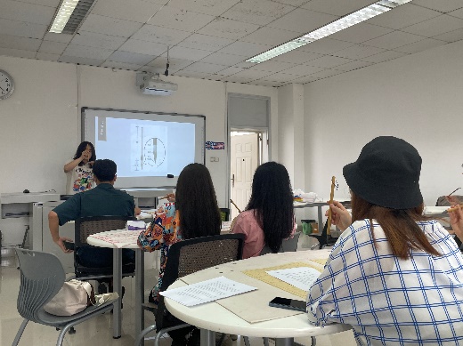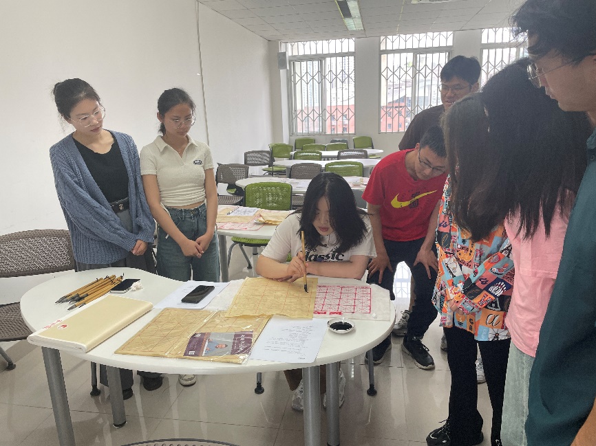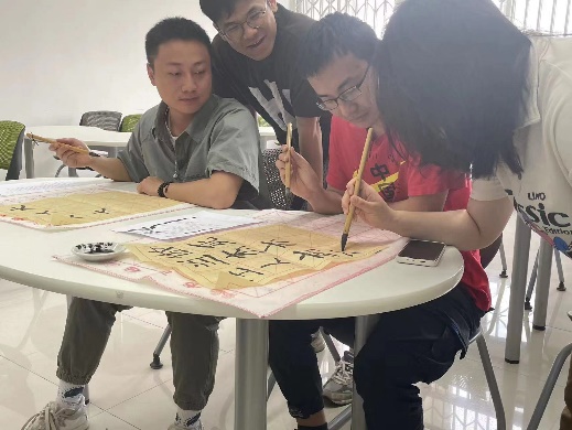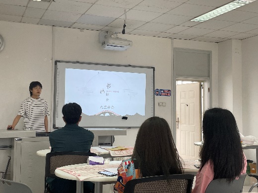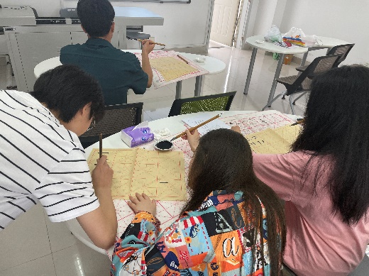 其次,老员工书画协会九里分会的同学对书画协会进行了简单的介绍,并带领大家一起学习毛笔字书法的相关知识,包括握笔姿势、笔划书写方式等。在同学们正式开始写作前,书画协会的同学线给大家进行现场教学,演示了如何正确握笔,并示范如何用毛笔写出规整的笔划。