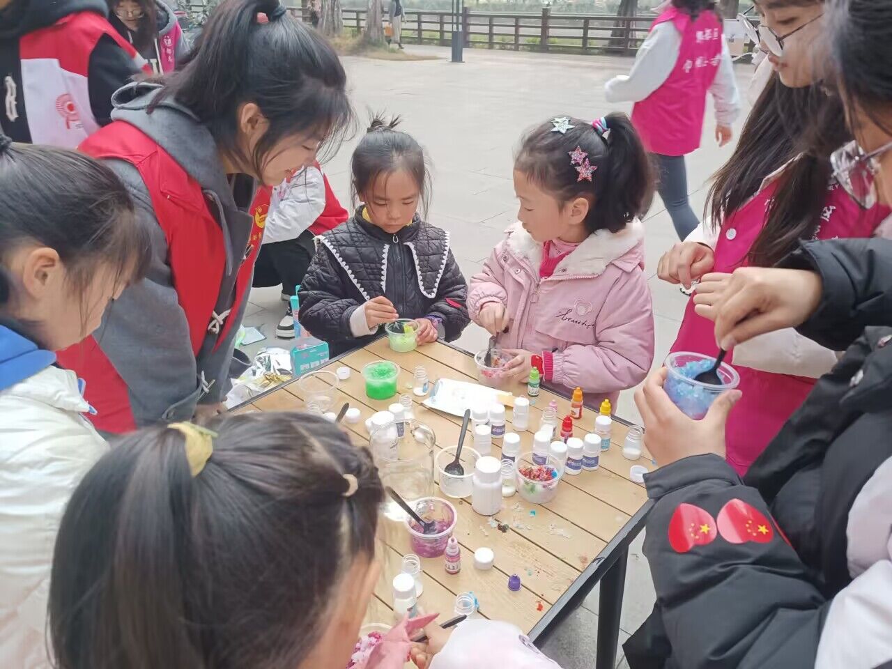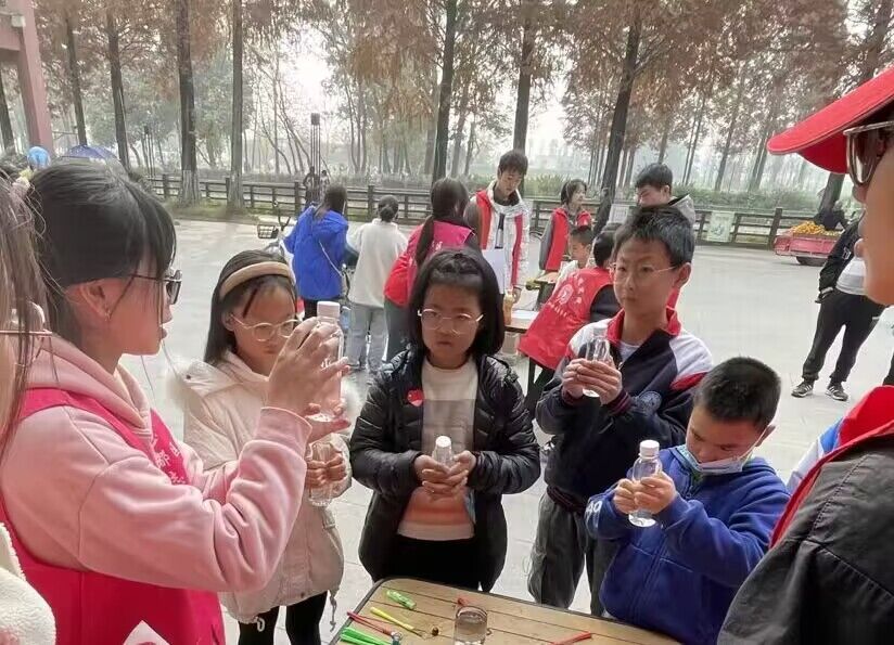 活动在下午两点半准时开始,志愿者们在活动场地搭建了四个站点。站点一是化学实验站点,志愿者和小朋友们一起完成了化学色素,小桔灯制作,五彩喷泉和人造雪等化学小实验。小朋友从中感受到了化学的乐趣,对于化学元素之间奇妙的反应有了更加深刻的认识。