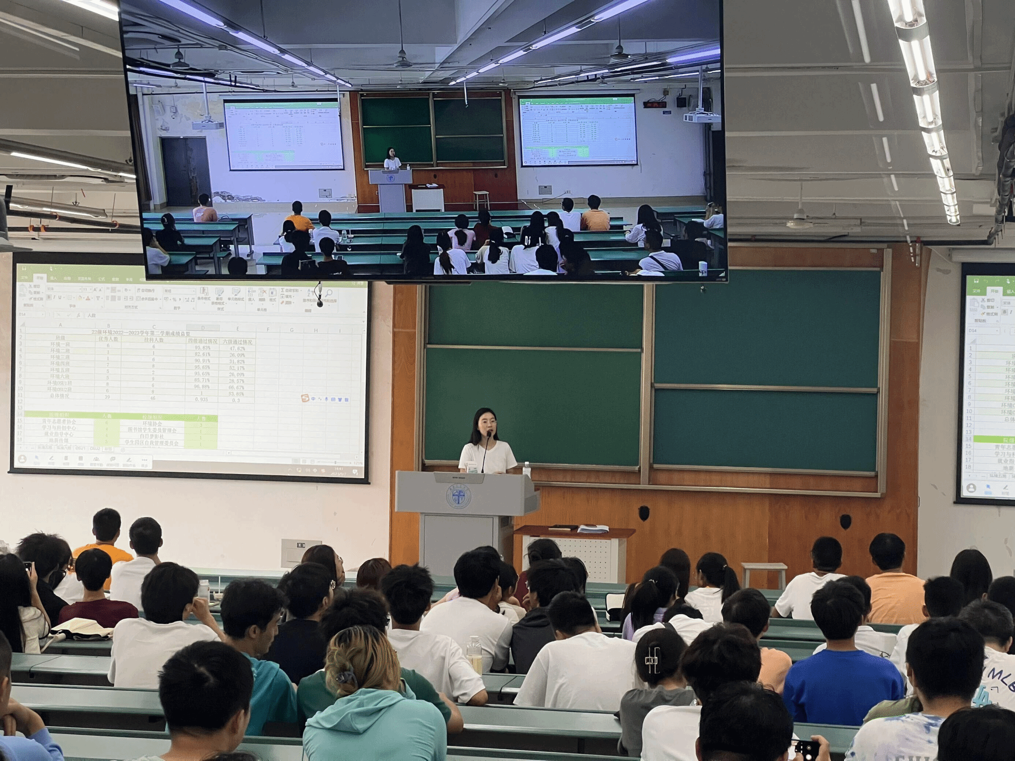 翟琦老师对上一学年的成绩及参与社团进行介绍。详细展示出各班的挂科及四六级通过情况,并勉励同学们在新的学年积极学习。随后并对同学们在2022学年参与的社团进行分类介绍,同时也希望同学们可以积极参与课外活动。