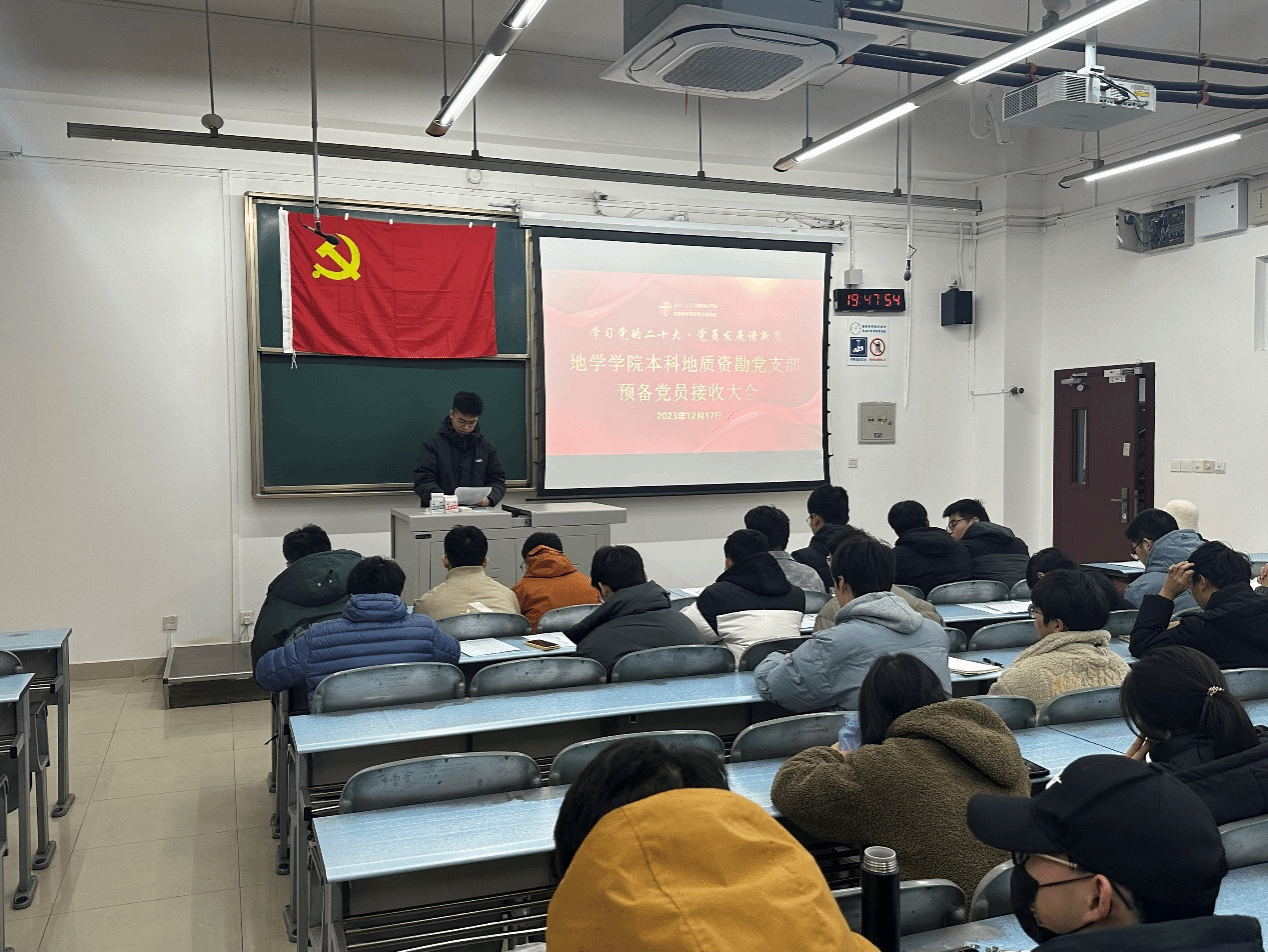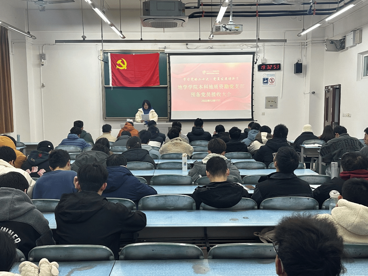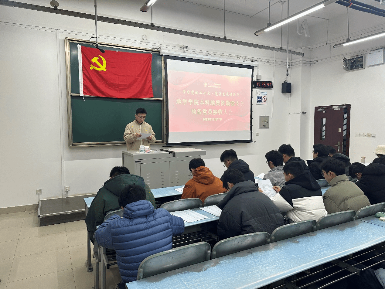 2023年12月8日19时30分,bevictor伟德官网本科地质资勘党支部在X2220教室顺利召开预备党员接收大会,本次大会的议题:讨论是否同意接收刘宗旭、杨晨、林星杰、乔彦博、赵高伟、李骁群、王国英、廖望和朱梓宁9名同志为预备党员。会议由党支部书记薛怡然同志主持,支部正式党员应到会10人,实到会8人。
