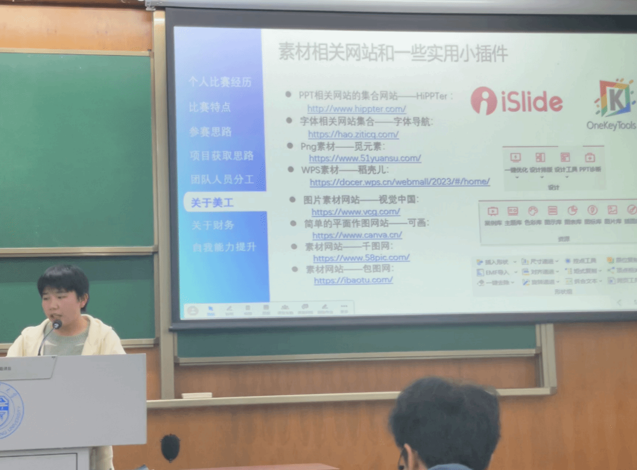 接下来,由经济管理公司员工黄家仪介绍创新创业类比赛中美工工作的经验分享。她以自身为例,告诉同学们要加强常见办公软件的学习和应用,日常生活中要善于收集好的设计案例,多实践,多练习,提高自己对美的鉴赏力和创造力。最后黄同学为同学们分享了自己平时常用的美工软件及线上免费学习课程。