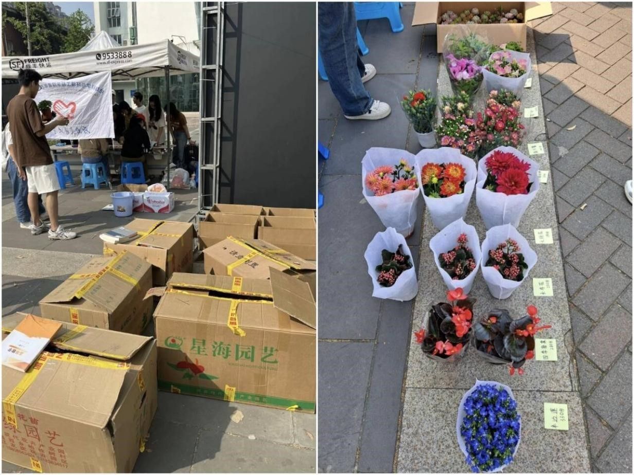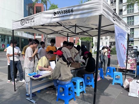 上午九点活动正式开始。本次活动志愿者共分成四组,从上午九点持续到晚上六点,始终站在为同学们服务的第一线上。志愿者们将精心挑选的鲜花摆放整齐并贴好标签后,吸引了许多同学前来询问和兑换鲜花。对于同学们的好奇与疑惑,志愿者们做出耐心、细致的解答,及时帮助前来参与活动的同学搬运鲜花、登记废品兑换的分数。活动现场还设有环保知识问答环节,帮助同学们巩固和拓展环保知识。与此同时,机动组的志愿者们驱车穿梭于南区和北区各个员工宿舍,帮助废品较多的同学将废品送往活动场地进行称重和积分兑换,整个活动现场热闹而有序。