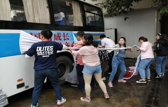 清洗完校车,志愿者于校车前合影纪念,踏着夕阳,回到了犀浦校区。
